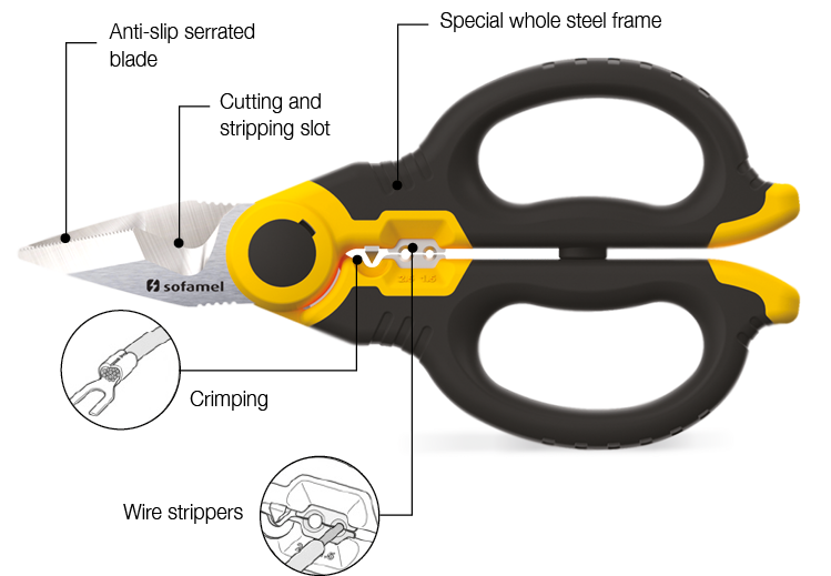 Premium professional scissors 3 in 1: crafted with stainless steel for super high resistance and durability. Featuring high-hardness blades and an anti-slip serrated edge for precise cutting. The handles are lightweight, robust, and made from impact-resistant plastic material, with anti-slip ridges for a secure grip.