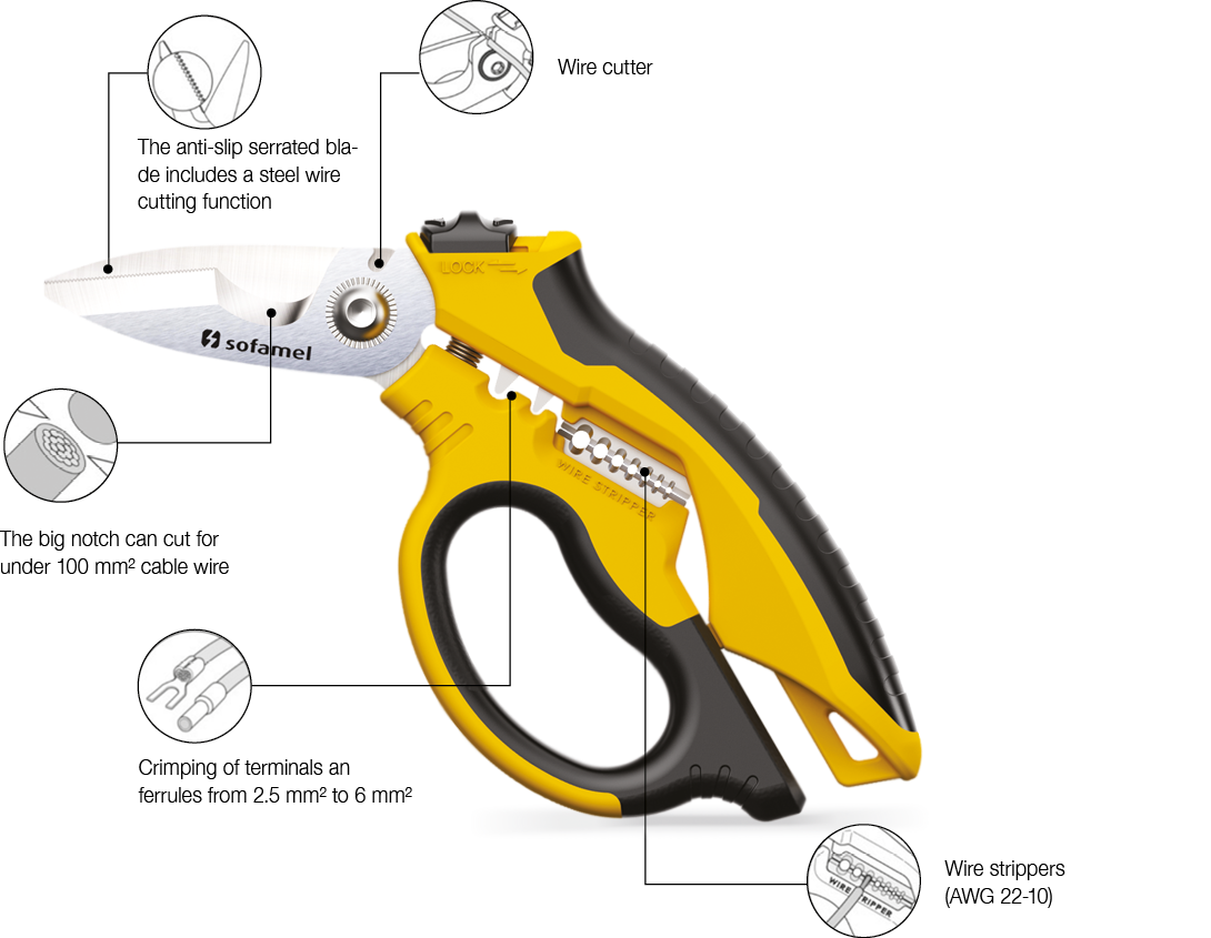 New Generation Professional Scissors: capable of cutting cables up to 95 mm². These scissors are equipped with a convenient wire stripping function compatible with cable sizes ranging from 0.34 mm² to 6 mm² (AWG 22 - 10). Crafted from high-quality, durable stainless steel, they are built to withstand the rigors of daily use.