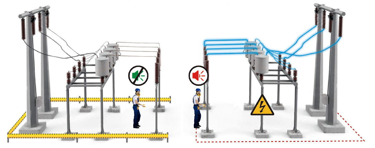 Cuando el operario se aproxima hacia un campo eléctrico el detector D-TUERI mantiene una señal acústica que indica al operario que se encuentra en una zona de peligro. Hasta que no se aleja de la fuente de tensión no cesa la alarma. El dispositivo siempre está alerta.