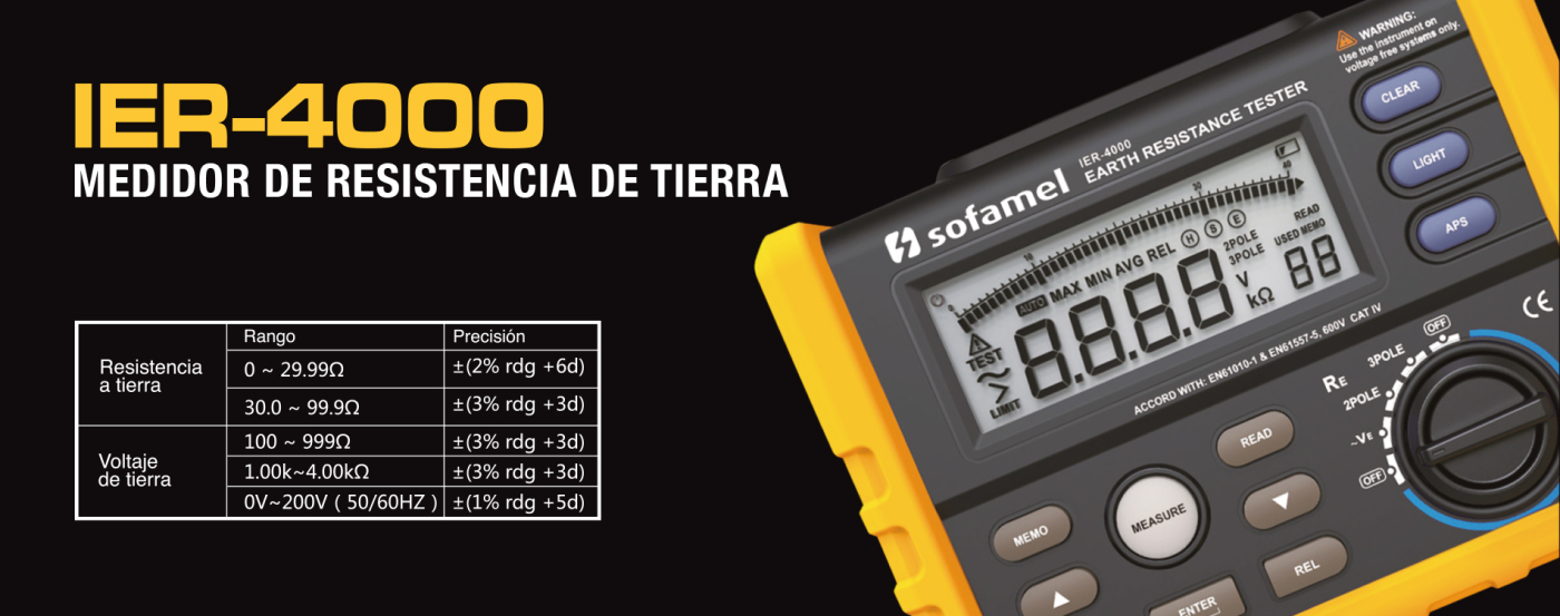 El medidor de tierra de última generación desarrollado por Sofamel, mide la resistencia hasta 4000 Ω, es de alta calidad y ofrece muy buen rendimiento. La gran pantalla digital LCD y las luces de fondo facilitan a los usuarios la lectura de la información en la pantalla LCD. Además, el IER-4000 puede almacenar hasta 100 grupos de datos de medición, que no se perderán incluso en caso de cortes de energía. De este modo el usuario puede consultar fácilmente los datos históricos. El comprobador también se puede utilizar para medir el máximo, el mínimo o la media y la medición relativamente. Dispone de la función de apagado automático.