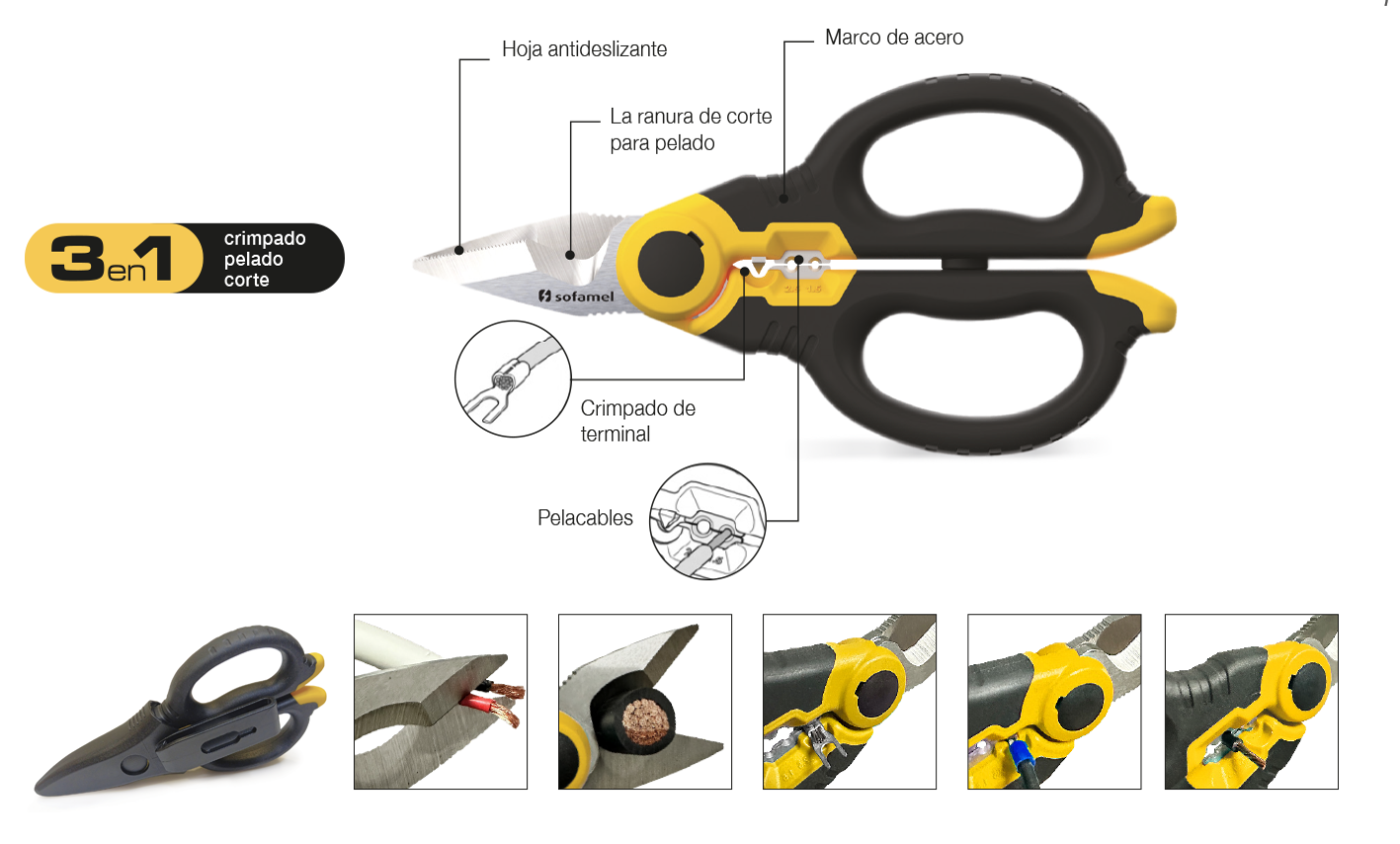 Las tijeras TS-50 están diseñadas para profesionales del sector eléctrico, ideales para las tareas cotidianas, combinando seguridad y facilidad de uso.Triple función: crimpado, pelado y corte