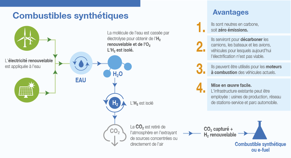 Les combustibles synthétiques sont considérés une alternative plus durable aux combustibles fossiles actuels, car ils peuvent se produire à partir de sources renouvelables, et aider ainsi à réduire les émissions de gaz à effet de serre. À la différence des carburants conventionnels tels que l'essence et le diesel, obtenus à partir du pétrole, les carburants synthétiques sont créés en synthétisant le CO₂ de l'atmosphère et l'hydrogène, qui est extrait de l'eau par hydrolyse.