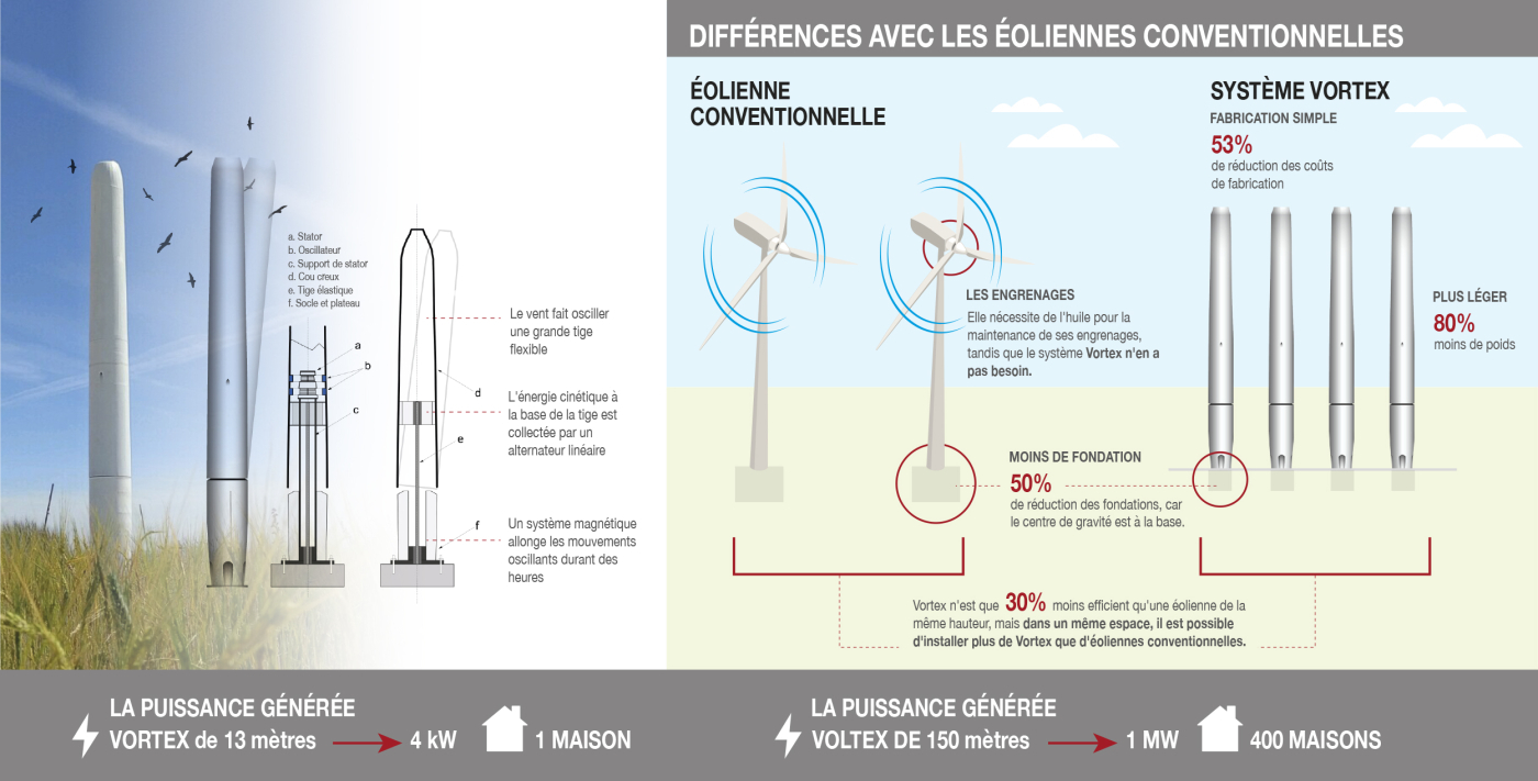 Le dispositif Vortex consiste en un mât qui oscille légèrement au vent pour produire de l'énergie. L'air passe dans la structure circulaire formant des tourbillons, c'est-à-dire des flux d'air en forme de spirale. Grâce à un phénomène physique appelé décollement de tourbillons, l'énergie cinétique de l'air est transformée en énergie électrique.