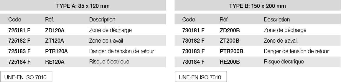 Signaux rectangulaires adhésifs imprimés sur une face et de dimensions 85 x 120 mm.