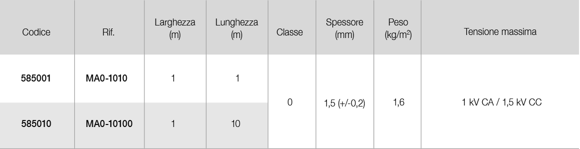 Tappetino isolante in gomma ad elevata resistenza. Tappetino con proprietà specifiche di isolamento per proteggere gli operatori dalle scosse elettriche. Il colore chiaro e luminoso è stato specificatamente studiato per il riconoscimento rapido del tappetino all’interno della zona di lavoro. Tappetini classe AZ, ossia certificati per resistenza agli acidi (Classe A), e all’ozono contenuto negli apparecchi di tipo elettrico (Classe Z).