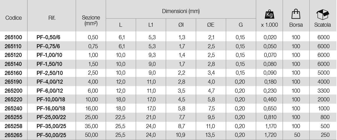 I capicorda terminali nudi serie PF sono tubetti in rame elettrolitico con finitura stagnata per un migliore contatto elettrico.