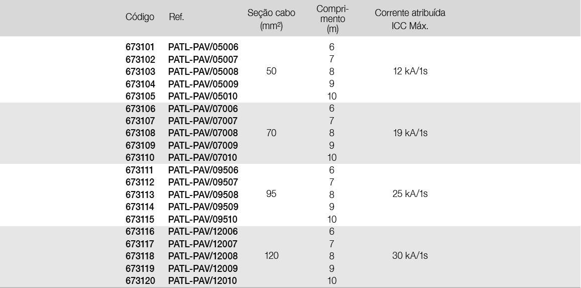 - 3 cabos de cobre com isolamento de PVC. Seção e comprimento conforme modelo.